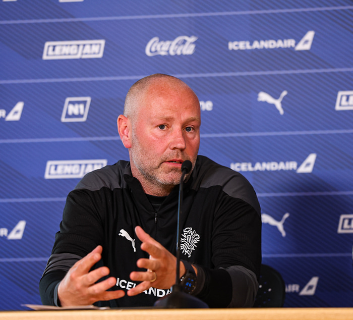 Hann sagði frá því að leikgreinendur liðsins væru Davíð Snorri Jónasson, Lúðvík Gunnarsson og Ólafur Ingi Skúlason, en þeir eru allir að þjálfa yngri landslið Íslands.