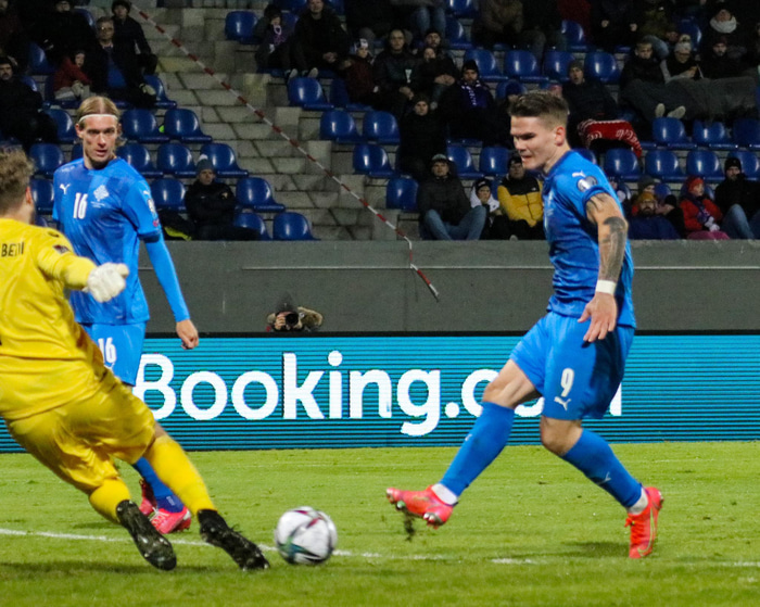 Viðar Örn Kjartansson fékk tækifærið í byrjunarliði landsliðsins í fjórða skiptið í síðustu fimm leikjum liðsins þegar Ísland mætti Liechtenstein í kvöld. Viðar átti stóran þátt í öðru markinu þegar hann skaut að marki og boltinn fór í hönd varnarmanns Liechtenstein.