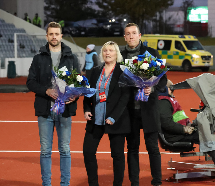 Fyrir leik voru tvær goðsagnir í íslenskum fótbolta heiðraðar. Vanda Sigurgeirsdóttir færði þeim Hannesi Þór Halldórssyni og Kára Árnasyni blómvendi.