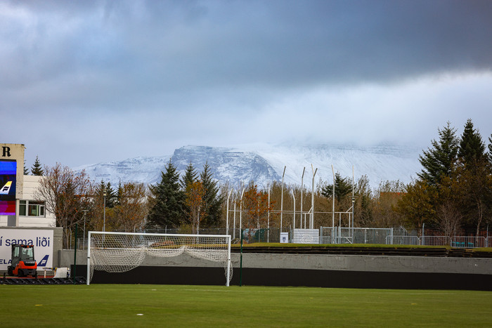 Vallarstarfsmenn Laugardalsvallar vinna baki brotnu þessa dagana enda landsleikir á næsta leyti. Að auki á Breiðablik að spila á vellinum í Sambandsdeildinni í næsta mánuði.