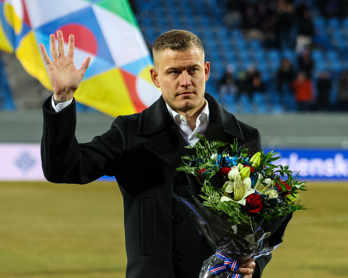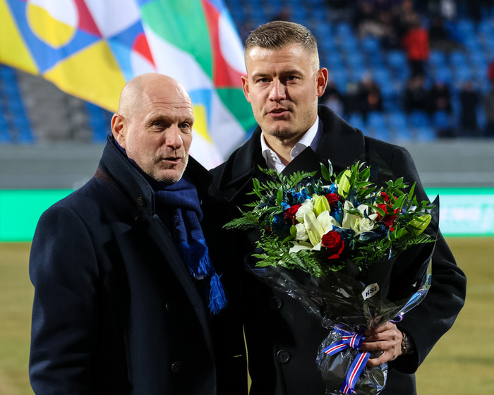 Þorvaldur Örlygsson, formaður KSÍ, færði Alfreð blómvönd. Í kjölfarið klöppuðu áhorfendur á Laugardalsvelli fyrir framherjanum.
