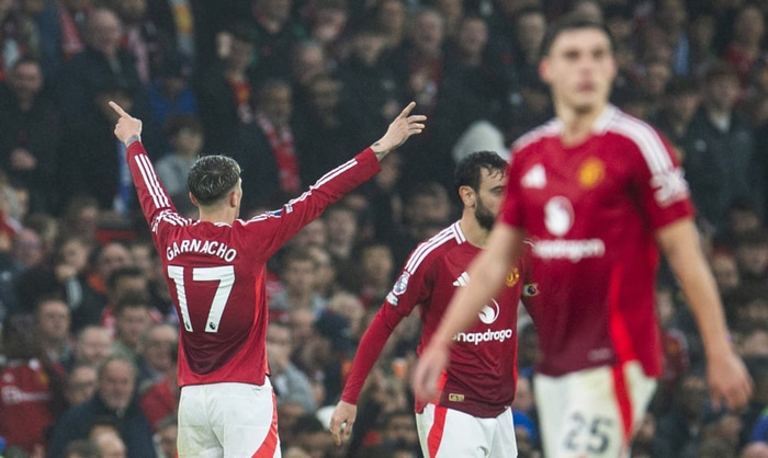 Athygli vakti að Garnacho fagnaði markinu ekki. Bruno Fernandes fyrirliði United fór upp að honum og sagði eitthvað við hann. Garnacho sneri sér síðan að stúkunni og fagnaði í átt að áhorfendum.