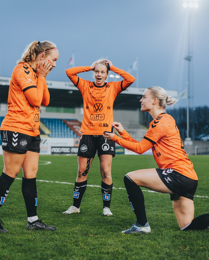 „Ég veit ekki alveg hvernig þessi hugmynd kom upp. Við vorum aðallega að hlæja að því að fá medalíu fyrir 4. sætið. Í Svíþjóð fær 4. sætið brons, 3. sætið fær litla silfur og 2. sætið silfur og meistararnir fá gull. Við vorum búnar að gleyma því fyrir leik að við fengjum medalíu eftir leikinn. Við tókum á móti þeim, fengum þær í svona boxi eins og trúlofunarhringur. Við lékum okkur því með þetta. Við bjuggumst reyndar ekki við því að þetta væri bæði í sjónvarpinu og fyrir framan ljósmyndara. Við settum upp smá leikþátt sem ég held að fólk hafi haft gaman af."