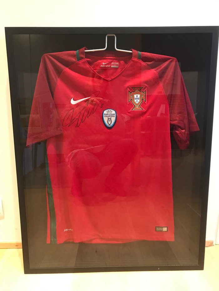 Treyjan er í flottum ramma og er árituð af Ronaldo sjálfum.