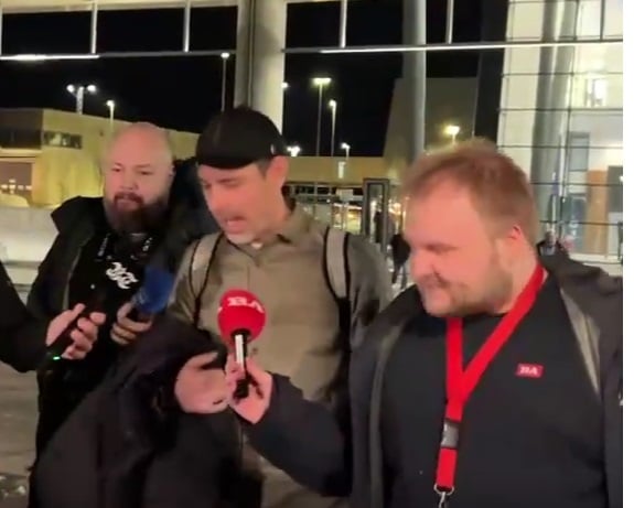 „Þetta er aðeins of mikið!" sagði Freyr brosandi á meðan fréttamenn eltu hann út úr flugstöðinni og út á bílstæðið. „Ég er með fimm hljóðnema í andlitinu, ég hef aldrei upplifað annað eins. Þetta gerist ekki á hverjum degi."