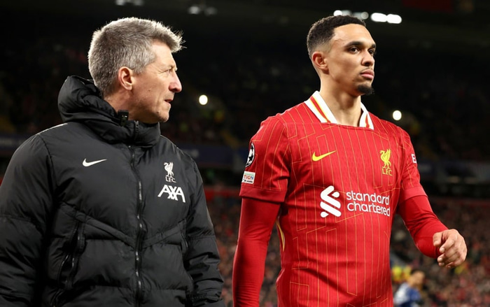 Alexander-Arnold þurfti að fara af velli þegar Liverpool tapaði gegn PSG eftir vítaspyrnukeppni í 16-liða úrslitum Meistaradeildarinnar eftir að hann snéri illa upp á hnéið á sér.