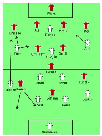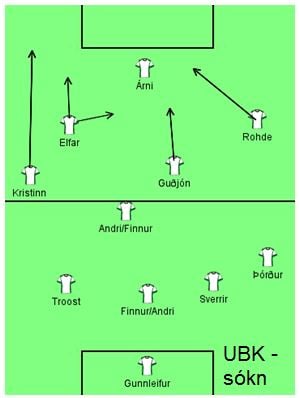 Með boltann leit uppstilling Blika þannig út eins og 3-4-3 (sjá mynd til hliðar). Kristinn spilaði mjög hátt uppi á vellinum, svo mjög að hann var oft í línu við hægri kantmanninn, hvort sem það var Nicolas Rohde eða Árni Vilhjálmsson. Elfar Árni Aðalsteinsson var svo mjög klókur með staðsetningar sínar; hann dró sig inn á völlinn af vinstri kantinum og opnaði svæði fyrir Kristin, en samvinna þeirra tveggja var afbragðs góð og minnti um margt á svipaða samvinnu Guðmundar Reynis Gunnarssonar og Óskars Arnar Haukssonar hjá KR síðustu 2-3 árin.