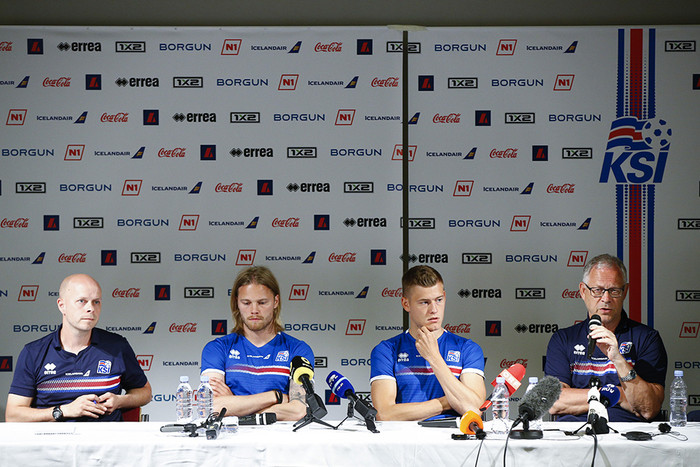 Fyrir svörum sátu þeir Birkir Bjarnason, Alfreð Finnbogason og Lars Lagerback þjálfari og með í för var Ómar Smárason fjölmiðlafulltrúi landsliðsins.