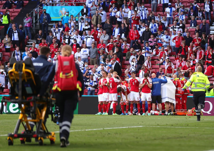 Leikmenn Danmerkur hópuðust í kringum Eriksen svo myndavélar á vellinum næðu ekki nærmynd af aðstæðum. Sjúkrastarfsmenn á vellinum virtust vera að framkvæma hjartahnoð og gáfu þeir Eriksen stuð.