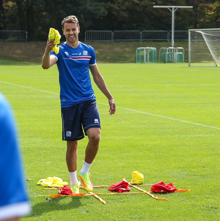 „Hann var að vitna í myndband af æfingu. Þetta er myndband frá upphitun og er svona í öllum liðum, eða kannski ekki öllum en flestum liðum í Evrópu eða heiminum. Þar sem er reynt að hafa gaman, búa til skemmtun og sigurtilfinningu. Það þarf ekki að leita lengi til að finna Kára hlæjandi á æfingu. Ég veit hvert Kári er að fara, hann vill meina að liðið þarf að vera þroskaðra og harðara. Ég skil það alveg. En það gerist bara með því að spila saman, fá reynsluna. Skilja út á hvað þessir landsleikir ganga. Kári skildi það ekki þegar hann var 21 árs, ég spilaði með Kára í landsliðinu og man eftir fullt af lélegum leikjum hjá Kára og mér líka."