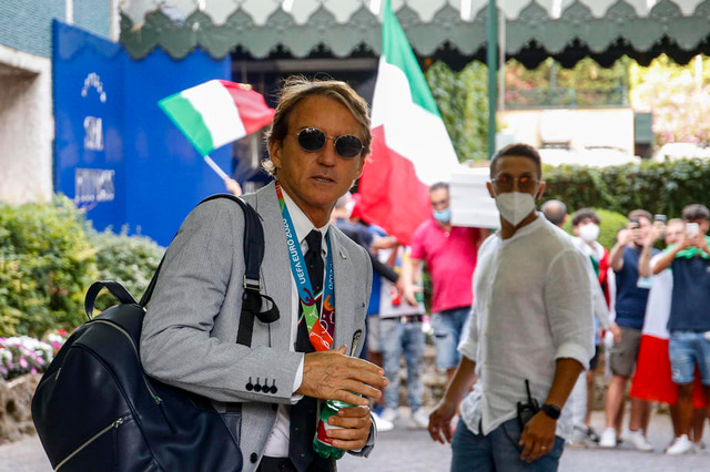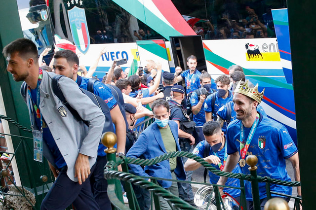 Evrópumeistarar Ítalíu flugu til Rómar í morgun en með í för var auðvitað sjálfur Evrópubikarinn. Roberto Mancini skálaði um borð í kampavíni ásamt forseta ítalska knattspyrnusambandsins, Gabriele Gravina.