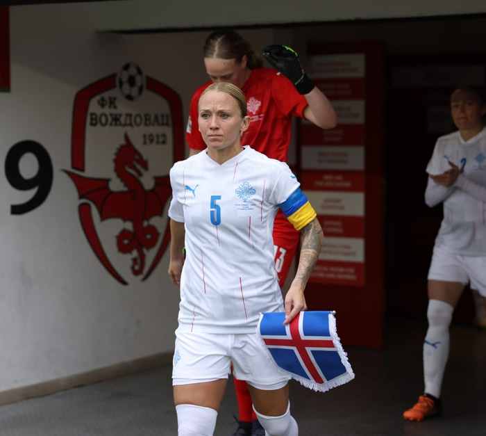 Það vakti mikla athygli er Glódís Perla Viggósdóttir tók við fyrirliðabandinu af Söru Björk Gunnarsdóttur í 1-1 jafnteflinu við Belgíu í fyrsta leik Evrópumótsins á sunnudag.