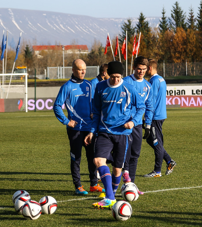 Landsliðsmennirnir voru því klárir í slaginn þegar æfing hófst klukkan 11:30 í morgun og flestir í nýjum skóm.