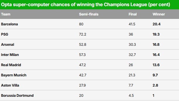 Það eru 20.4% líkur á því að Barcelona vinni keppnina en PSG er rétt á eftir í öðru sæti með 19,3% og Arsenal í þriðja með 16,8%.
