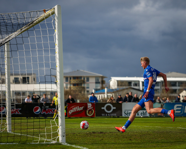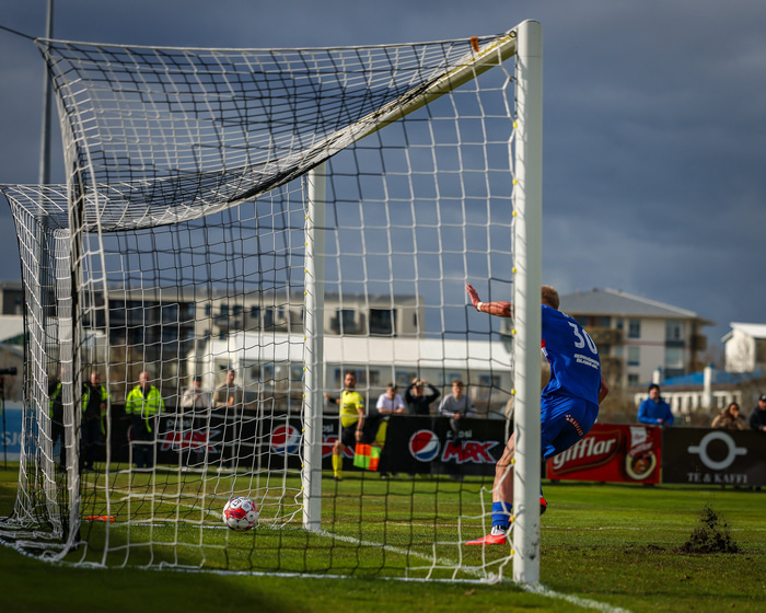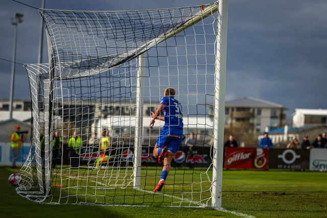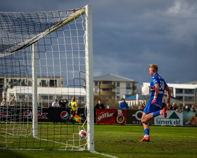 Liðsfélagar Atla hjá HK náðu ekki að fagna markinu innilega með honum því hann lá meiddur í kjölfar þess að hann kom boltanum í netið.