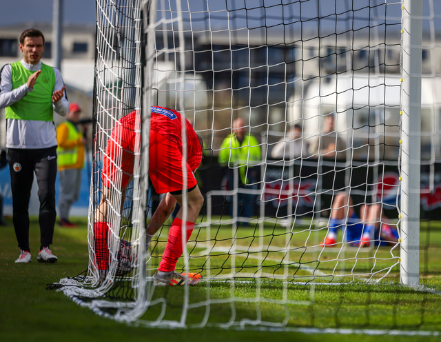 Á meðfylgjandi myndum af því þegar Atli skorar virðist sem hann stígi í holu í teignum rétt eftir að hafa rennt boltanum í átt að tómu markinu og misst fæturna og stór sandstrókur gaus upp úr vellinum. Atli varð í kjölfarið að fara af velli meiddur.