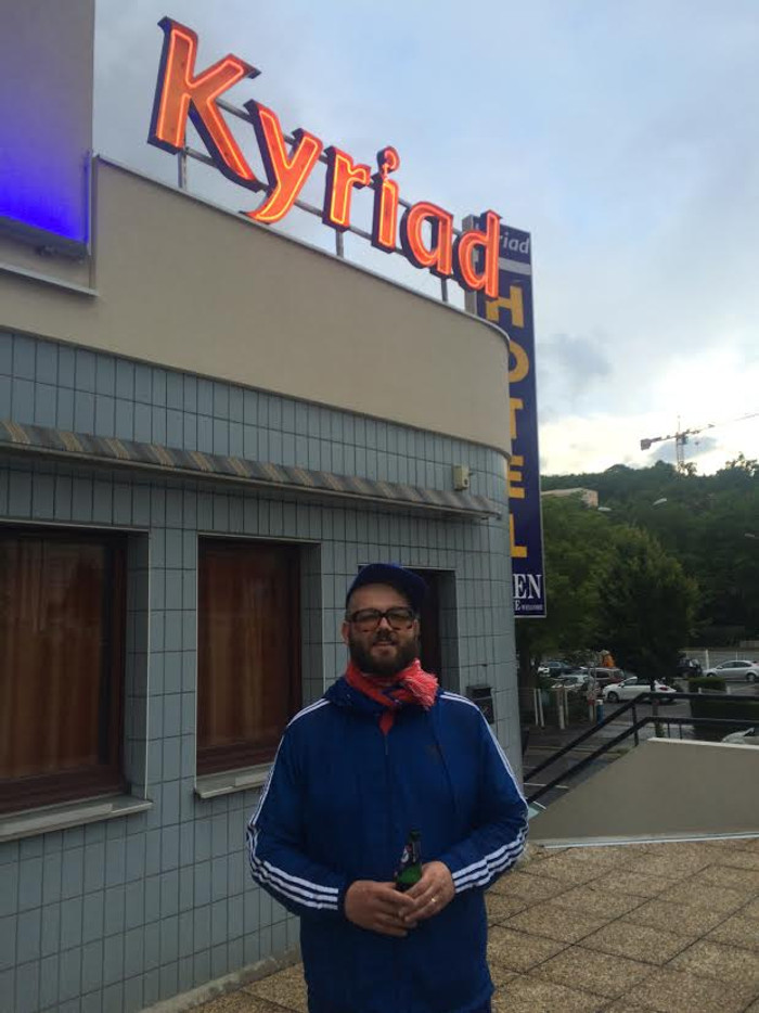 Samúel Jón Samúelsson, tónlistarmaður og stuðningsmaður íslenska landsliðsins var kátur þegar blaðamaður Fótbolta.net rakst á hann á hóteli í St Etienne.