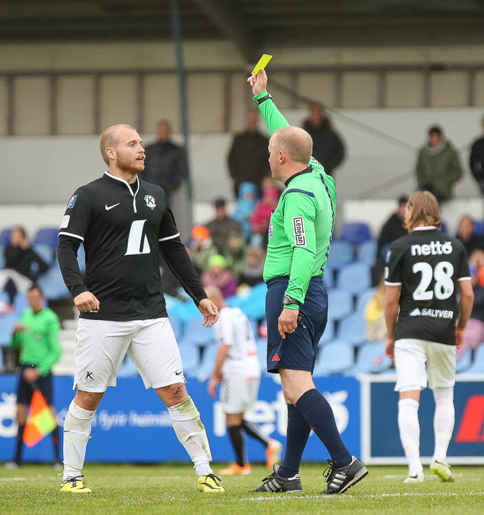 Einar Orri fær að líta gula spjaldið gegn ÍBV fyrr í sumar. Hann býst við að rauða spjaldið fari á loft í kvöld.