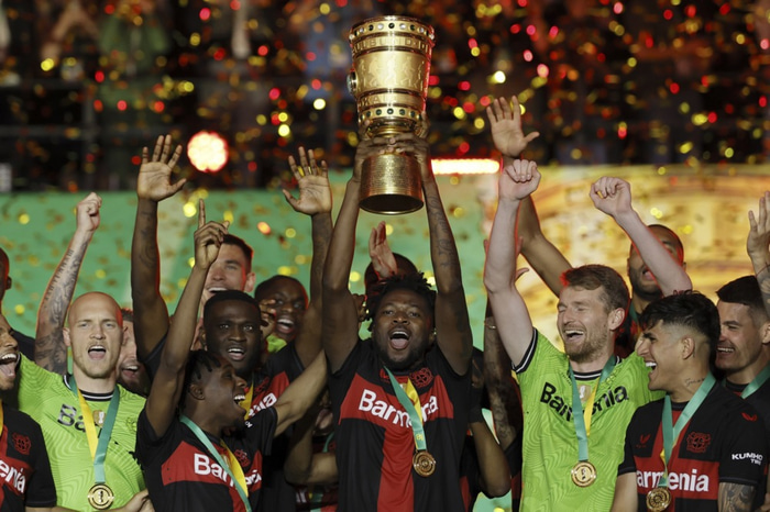 Kossounou heldur hér á Þýskalandsmeistarabikarnum eftir magnað tímabil með liðsfélögunum í Leverkusen.