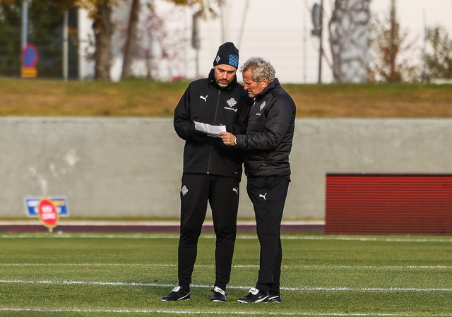 Ekki er búið að gefa út hverjir verða á hliðarlínunni á leiknum á morgun en líklegt er talið að það verði Þorvaldur Örlygsson og Davíð Snorri Jónasson, þjálfarar U19 og U17 landsliða Íslands.