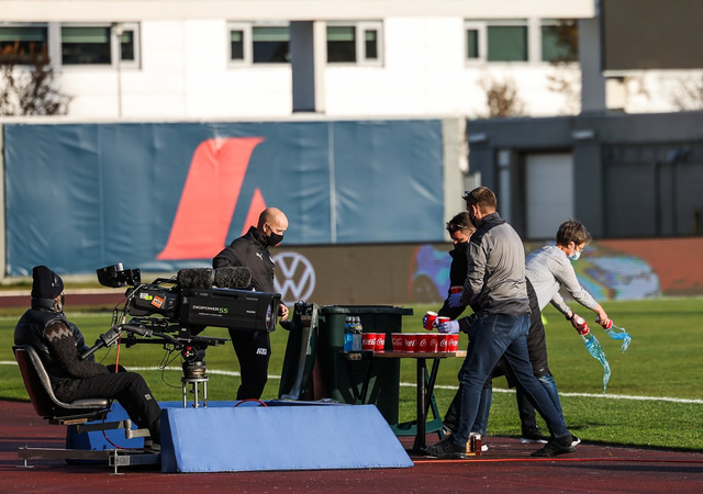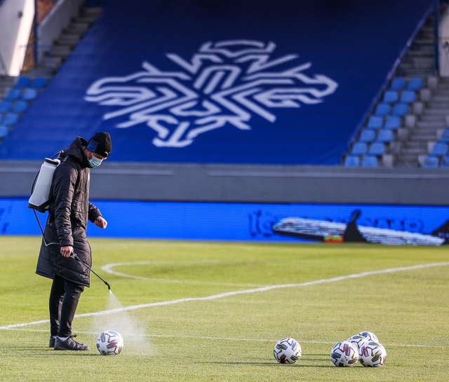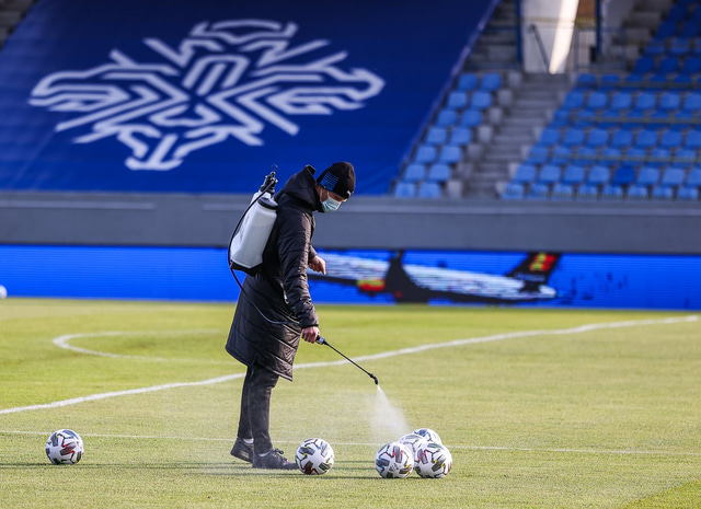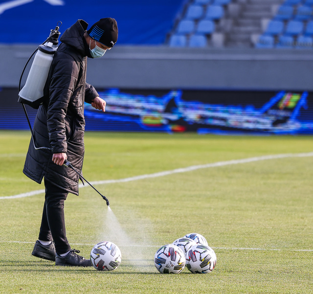 Í kjölfarið mætti þarna maður með sótthreinsunargræjur, hreinsaði borðið og alla bolta og búnað sem leikmenn nota á æfingunni.