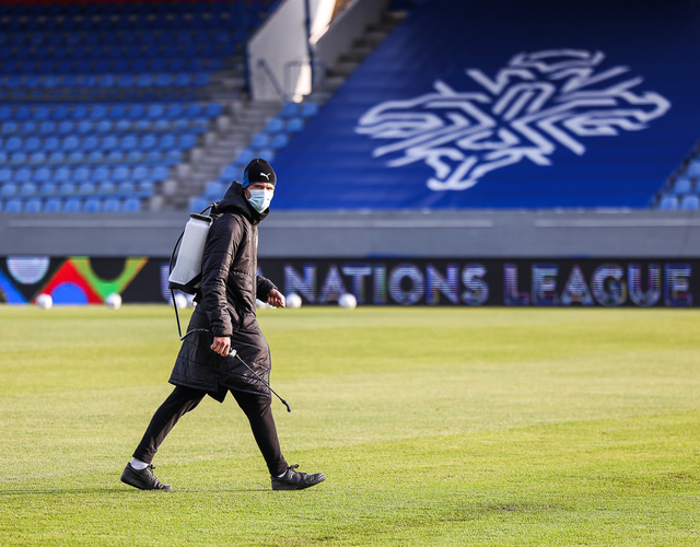 Á meðan yrðu allar sóttvarnir settar upp um eitt stig. Spurningar vakna um hvort leikurinn gegn Belgíu annað kvöld sé í hættu.