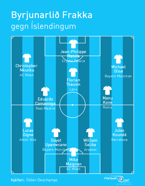 Marga sóknarmenn vantar í franska liðið (Mbappe, Dembele, Doue, Barcola, M. Thuram, Kolo Muani og Cherki) og Mateta fær því tækifærið og fyrir aftan hann er Florian Thauvin, 32 ára leikmaður Lens, en hann hefur ekki byrjað landsleik síðan sumarið 2019.