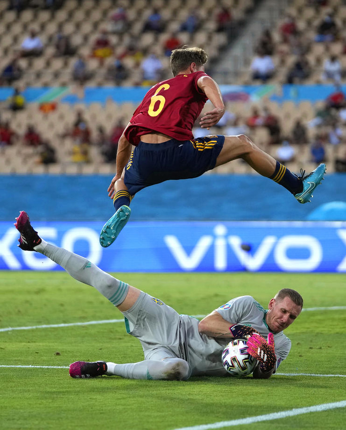 Olmo fékk annað tækifæri til að skora fyrir Spán á 73. mínútu en boltinn var á leið útaf hægra megin á vellinum er Llorente mætti á ferðinni og kom honum fyrir á Olmo sem lagði hann fyrir sig og skaut á markið en Danielson náði að komast fyrir á ögurstundu.