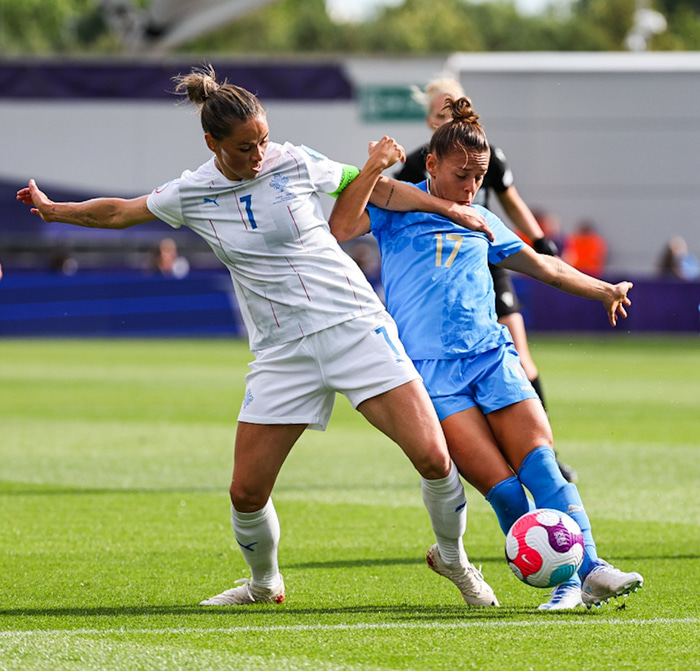 Ísland gerði 1-1 jafntefli við Ítalíu í 2. umferð riðlakeppni EM kvenna í dag. Karólína Lea Vilhjálmsdóttir skoraði mark Íslands á 3. mínútu en þær ítölsku jöfnuðu metin í seinni hálfleik. Bæði lið fengu tækifæri til að skora fleiri mörk í leiknum.