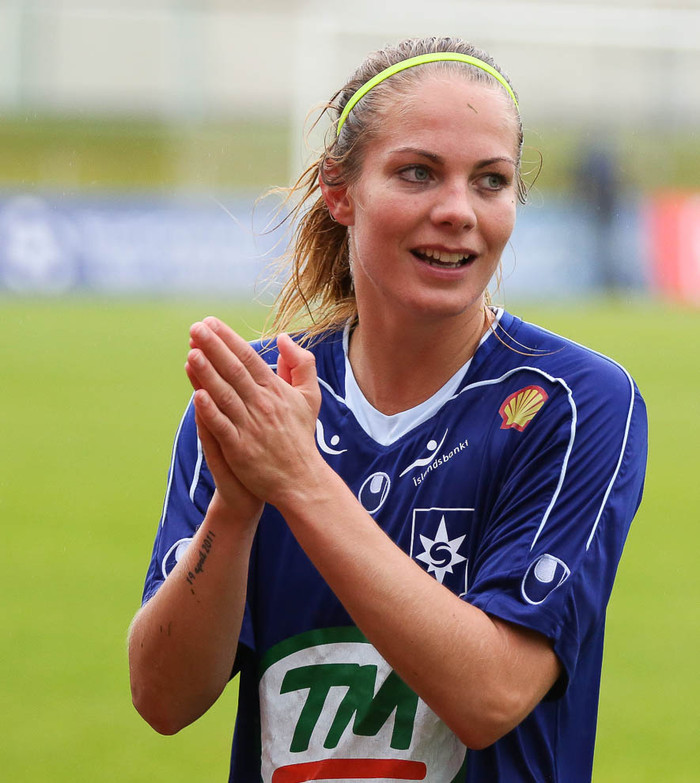 ,,Ég hef nú ekkert verið að æfa þetta eitthvað sérstaklega. Ég held að ég sé þekkt fyrir að nota rassinn á mér til að snúa af mér leikmenn. Ætli þetta hafi nokkuð komið einhverjum á óvart," sagði Harpa sem leikur með íslenska landsliðinu í næstu viku, mikilvægan leik gegn Danmörku á Laugardalsvelli. Hún var strax byrjuð að undirbúa sig fyrir þann leik með því að fá sér einn kleinuhring eftir leik.