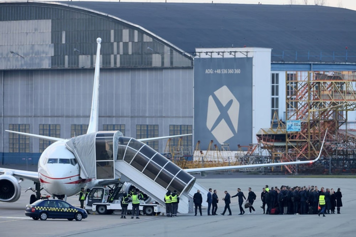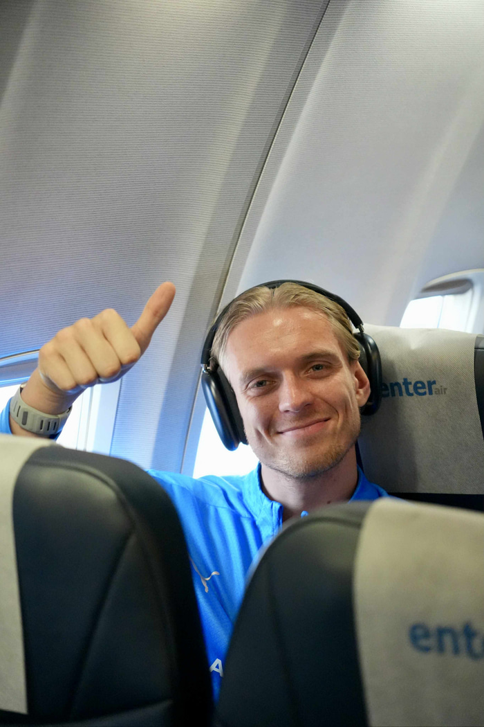 Liðið fór ásamt starfsliði og íslenskum fjölmiðlamönnum í leiguflugi frá Bakú. Sá sem þetta ritar var með í för en lenti í hremmingum og var handtekinn við vegabréfseftirlitið á flugvellinum í Varsjá.