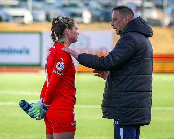 „Ég er mjög ánægð þetta. Ég sá ekki boltann í eina sekúndu, þökk sé Rajko (Stanisic) er maður orðinn fínn í snöggum viðbrögðum uppi og boltinn birtist allt í einu upp og maður þurfti bara að hoppa og teygja sig í hann."