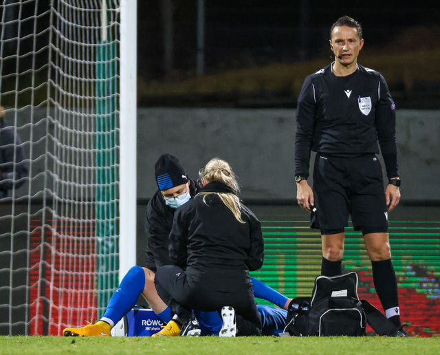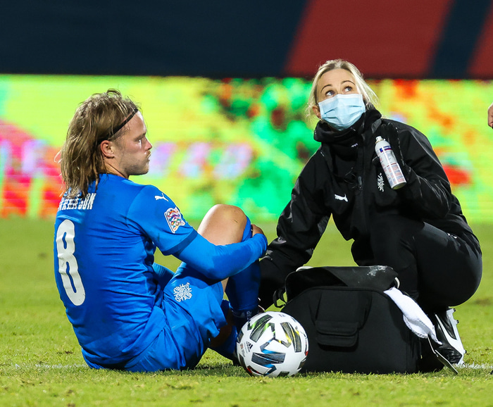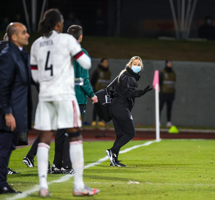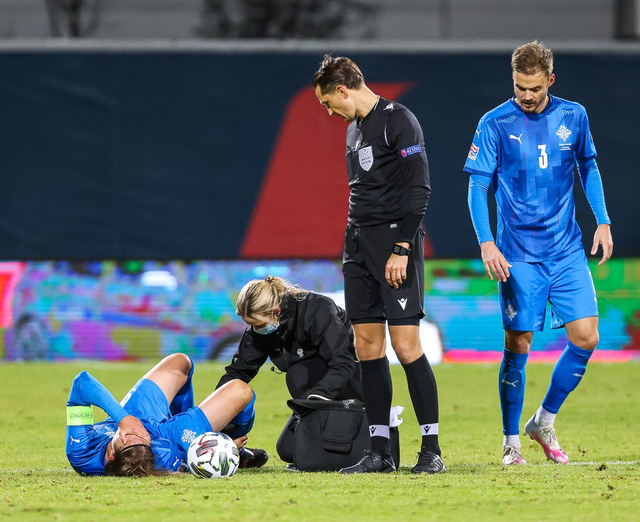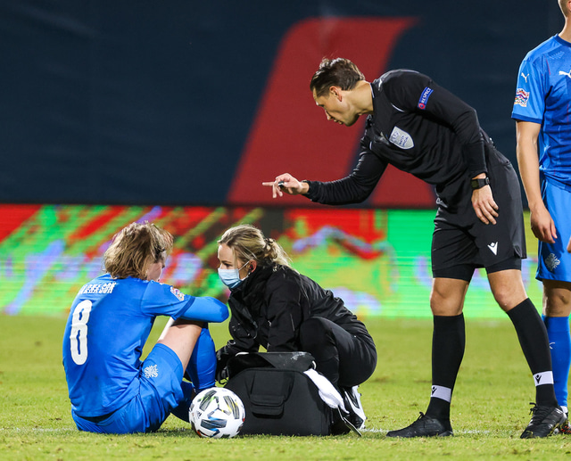 Einn af þeim er kona, Ásta Árnadóttir fyrrverandi landsliðskona Íslands en það kom í hennar hlut að koma inn á völlinn þegar leikmenn íslenska liðsins meiddust.