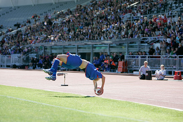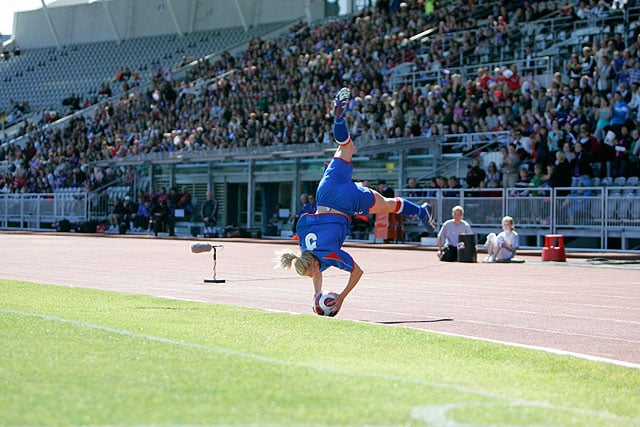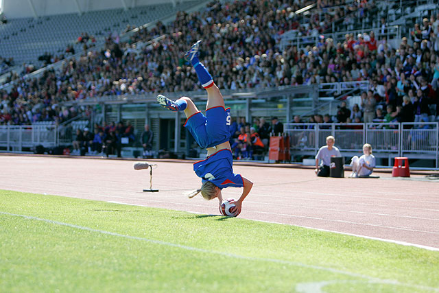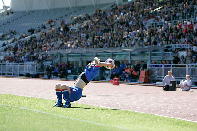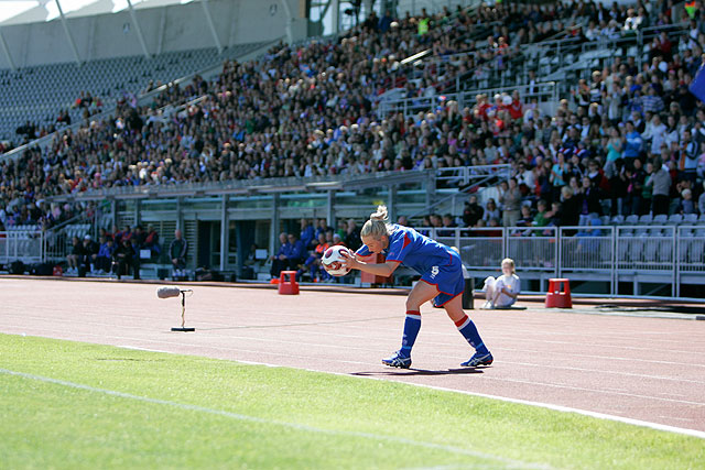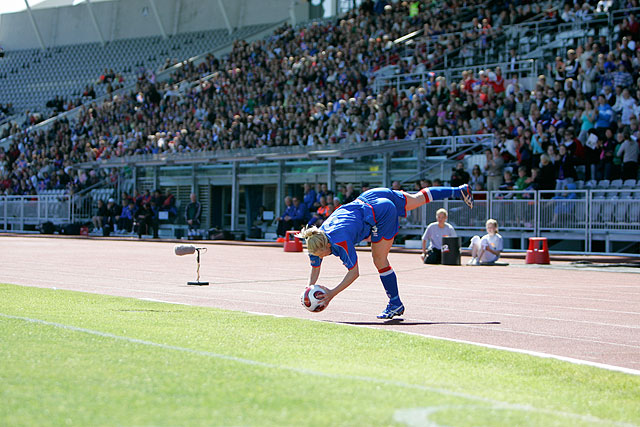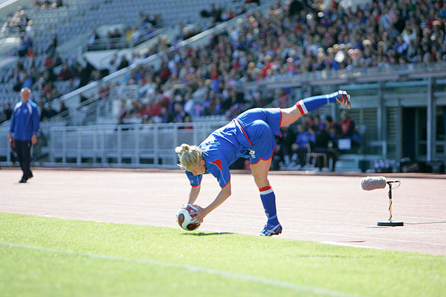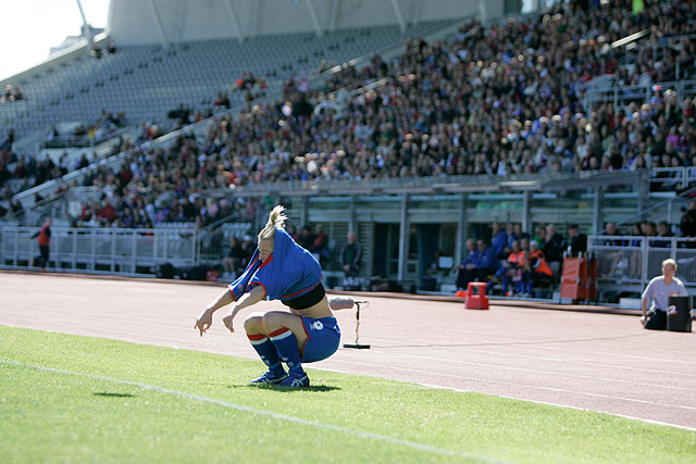 Ásta er allajafna sjúkraþjálfari með kvennalandsliðinu sem hún einmitt lék með við svo góðan orðstýr í gamla daga. Þar var hún heimsfræg fyrir flikk-flakk innköstin sín sem má sjá á myndunum að neðan ásamt myndum af henni að störfum í gær.