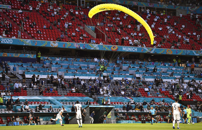 Það voru nokkrir fluttir á sjúkrahús í gær eftir að hafa fengið brak í sig þegar mótmælandi lenti á fallhlíf á Allianz Arena í gær. Í gær fór leikur Þýskalands og Frakklands fram á vellinum.