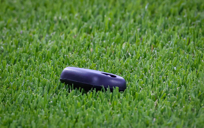 Óvæntur aðskotahlutur lá í grasinu nærri vítateig Ísraels í landsleik liðsins við Íslands á Laugardalsvelli á mánudaginn.