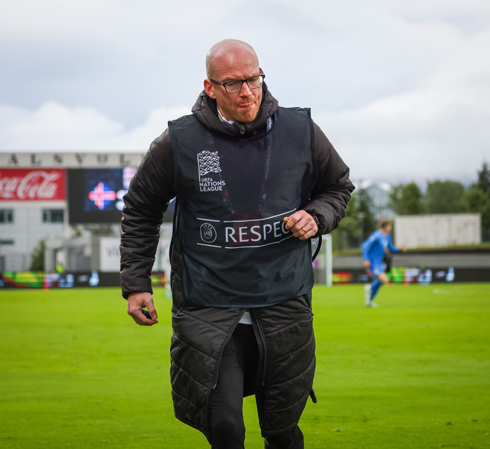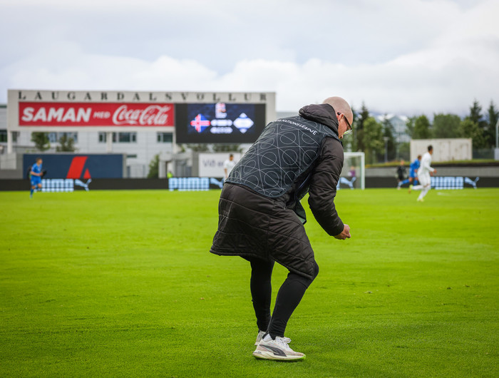Við fyrsta tækfæri tók hann sprettinn inn á völlinn meðan Ísland var með boltann á sínum vallarhelmingi og náði í aðskotahlutinn.