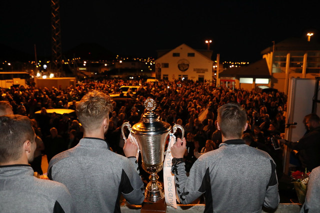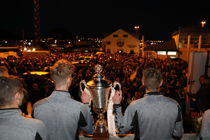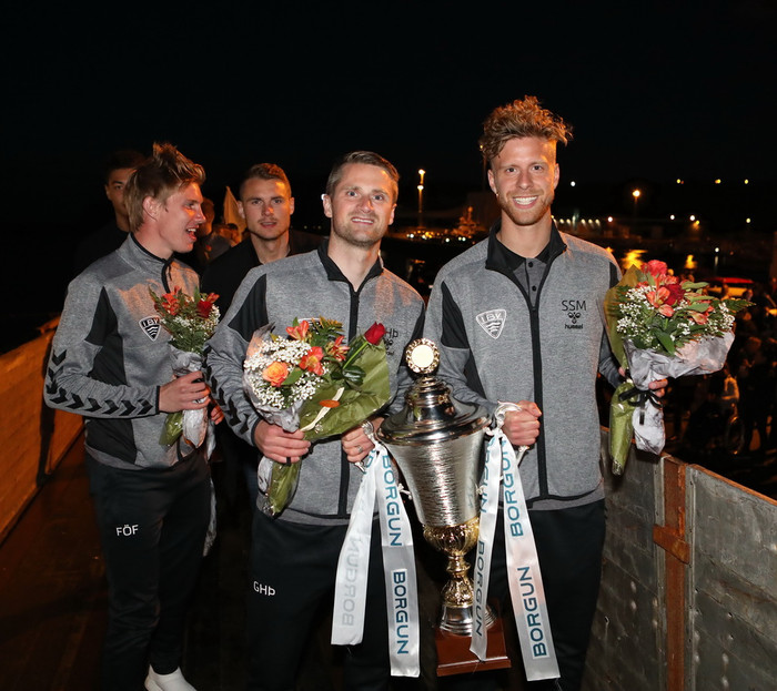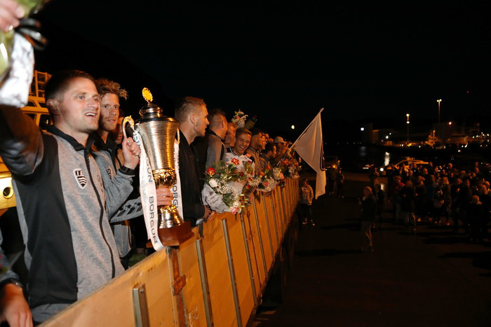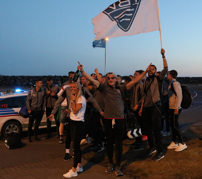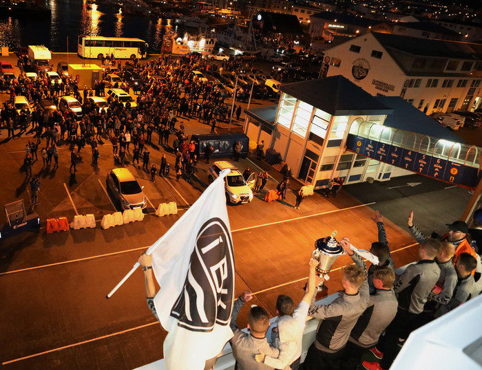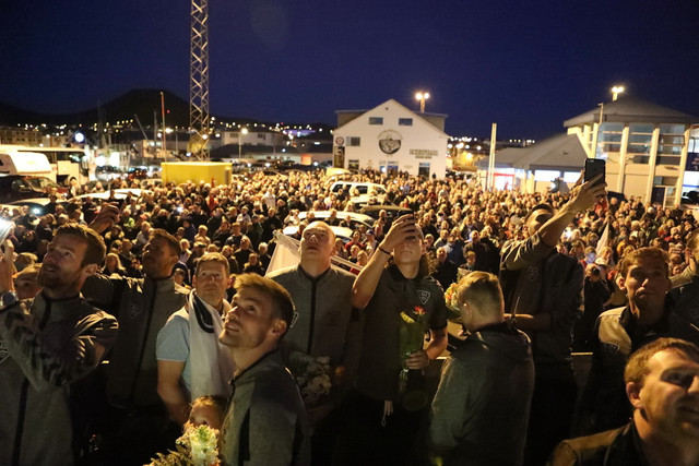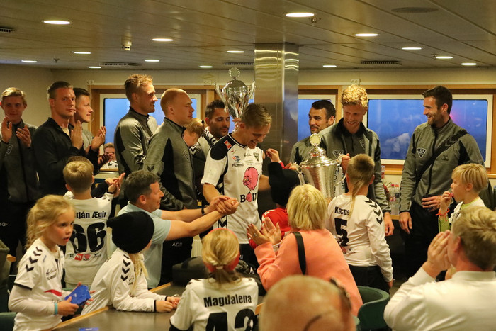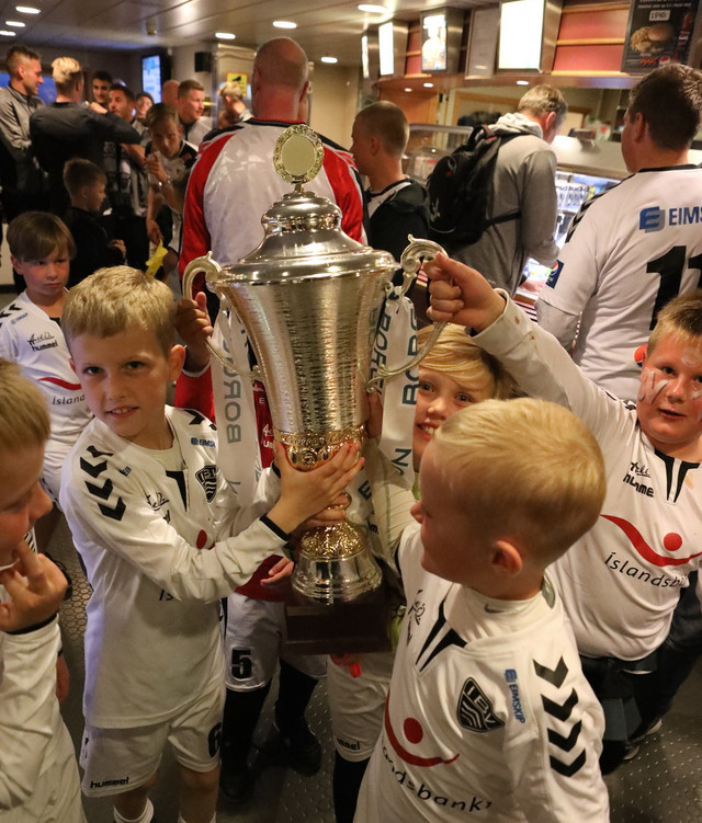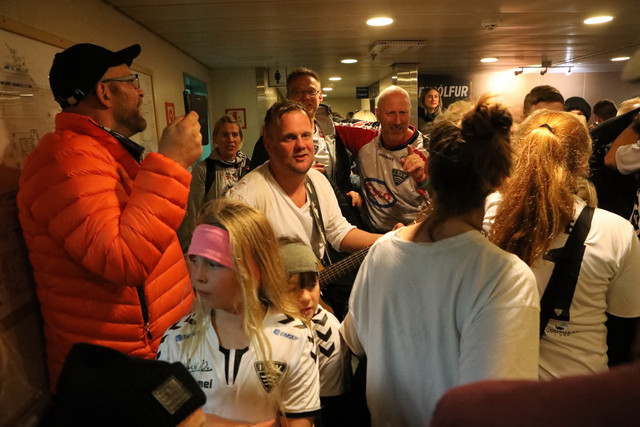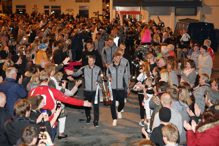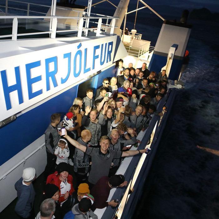 Seint um kvöldið var svo mikið húllumhæ í Vestmannaeyjum þegar liðið sigldi inn með Herjólfi. Hér að neðan má sjá myndir Ragga Óla af þessum mögnuðu móttökum.