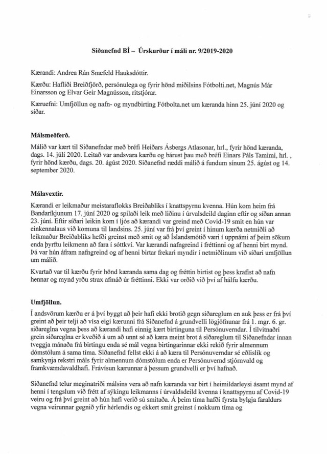 Siðanefnd Blaðamannafélags Íslands hefur kveðið upp þann úrskurð að þrír starfsmenn Fótbolti.net hafi brotið siðareglur félagsins með því að nafngreina og birta myndir af Andreu Rán Snæfeld Hauksdóttur, leikmanni Breiðabliks og Íslenska landsliðsins, í tengslum við umfjöllun um að hún hefði komið til Íslands smituð af Covid-19 veirunni en greinst neikvæð í skimun á landamærunum – sem aftur leiddi til frestunar Íslandsmóts, sóttkvíar knattspyrnuliða og loks breytinga á reglum um sóttvarnir.