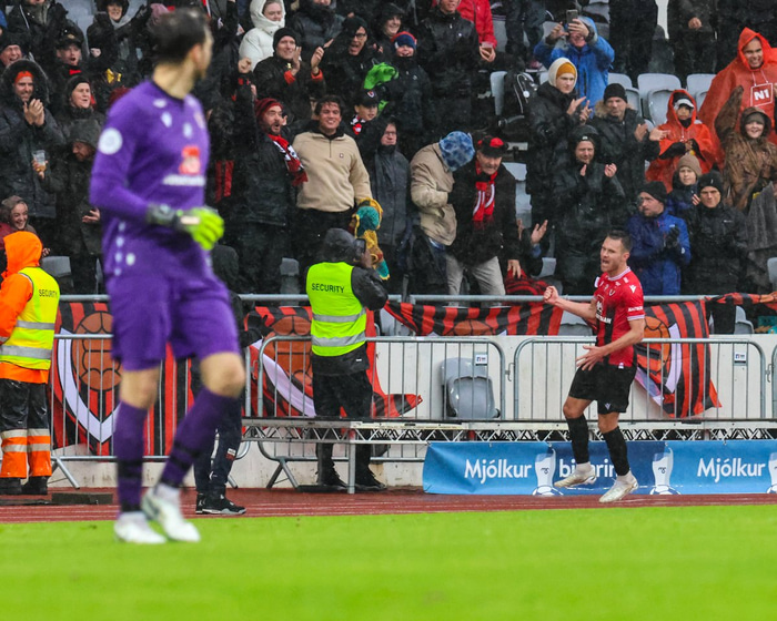 Ívar Örn Árnason minnkaði muninn fyrir KA á 82. mínútu er hann fékk boltann hægra megin í teignum og setti hann vinstra megin við Þórð Ingason í markinu.