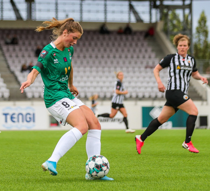 Hin 19 ára gamla Karólína varð Íslandsmeistari með Breiðabliki í sumar og kom inn í byrjunarlið íslenska landsliðsins í undankeppni EM.