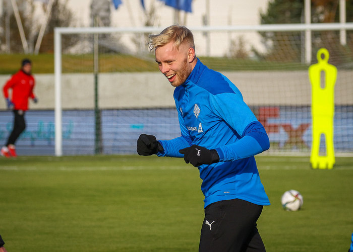 „Ég og Gudjohnsen vorum saman, ég get alveg sagt að hann er búinn að láta mig finna fyrir því að ég er ungi strákurinn í fyrsta landsliðsverkefninu. Ég má ekki gleyma lyklinum að herberginu, hann er ekkert að fara hleypa mér inn! Hann er skemmtilegur og búið að vera frábært með honum og öllum hinum. Ég er búinn að kynnast mörgum nýjum strákum og þetta er búið að vera ógeðslega gaman. Ég er svo þakklátur fyrir að vera hérna."