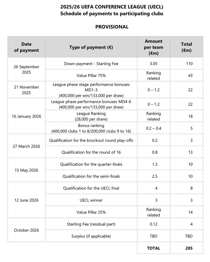 Fyrir það eitt að komast inn í Sambandsdeildina fær Breiðablik 3.170.000 evrur sem skiptist í tvær greiðslur. Fyrri greiðslan átti sér stað þann 26. september og nam 3.050.000 evrum, tæplega 433 milljónir króna. Sama dag fékk Breiðablik líka greitt 75% af virðisstoðinni (e. Value Pillar) en sú greiðsla byggir á sjónvarpsréttindum og styrkleikaröðun liða. Nákvæm fjárhæð verður ekki ljós fyrr en á 51. þingi UEFA sem verður haldið vorið 2027, en þá verður fjárhagsskýrsla UEFA fyrir tímabilið 2025/26 birt. Það má þó nefna að Breiðablik fékk 110 þúsund evrur frá virðisstoðinni þegar liðið spilaði síðast í Sambandsdeildinni.