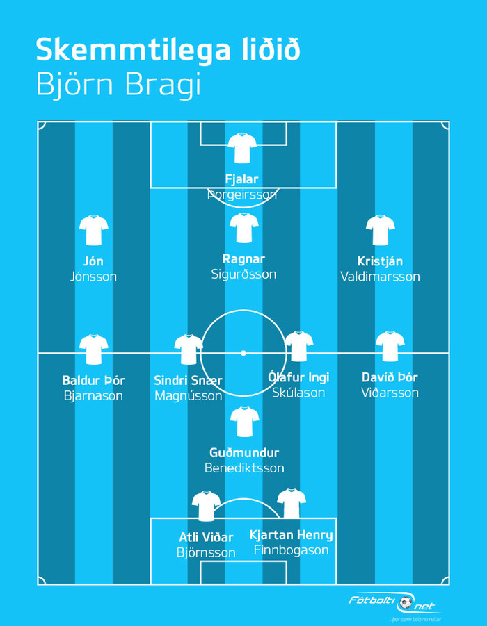 „Ég veit ekki hvort hinn almenni knattspyrnuáhugamaður átti sig á því hvað hann er skemmtilegur. Við vorum saman í grunnskóla og hann fór einhverntímann upp á svið í félagsmiðstöðinni Árseli og var fyndinn í 20 mínútur og allir hlógu. Þetta var fyrsta uppistandið sem maður sá," sagði Björn en Davíð Þór Viðarsson er einnig í liðinu hjá honum.