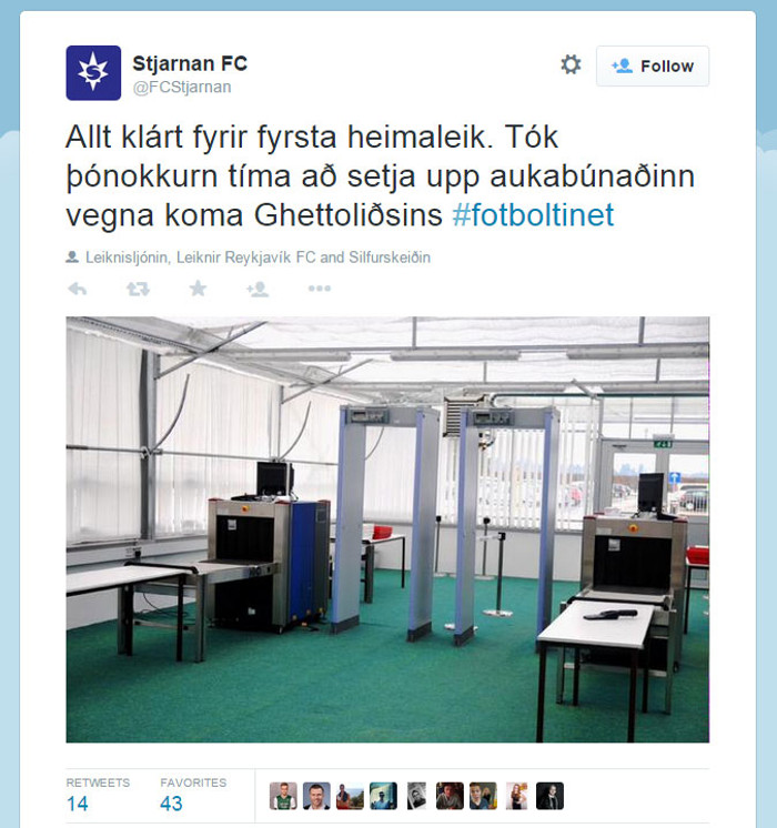 Opinber Twitter síða Stjörnunnar birti í gærkvöldi mynd af vopnaleitarhliðum og sagðist vera að undirbúa komu Leiknismanna úr Breiðholtinu. Félagið hefur fengið bágt fyrir á Twitter í dag.