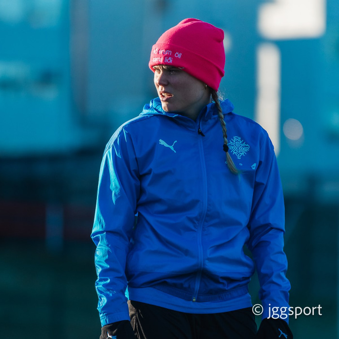 Agla María er kantmaður sem er fædd árið 1999, en hún hefur leikið 58 A-landsleiki og skorað í þeim fjögur mörk.