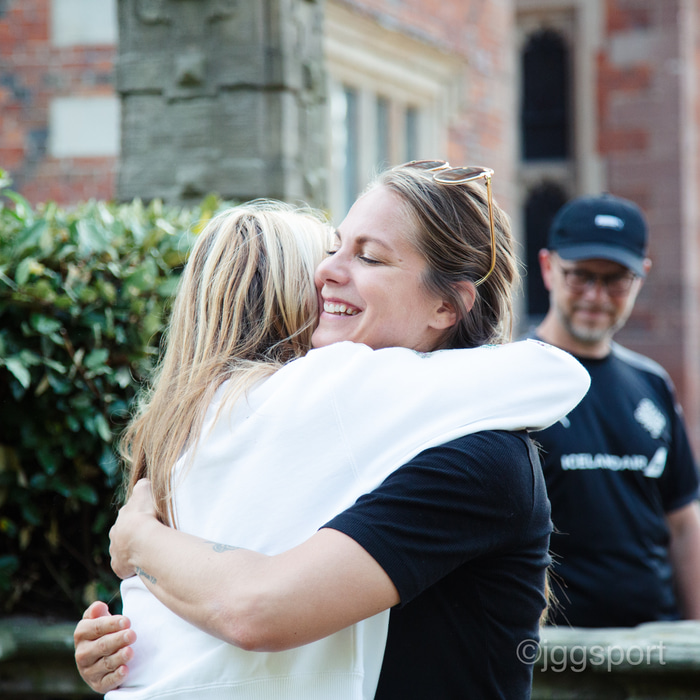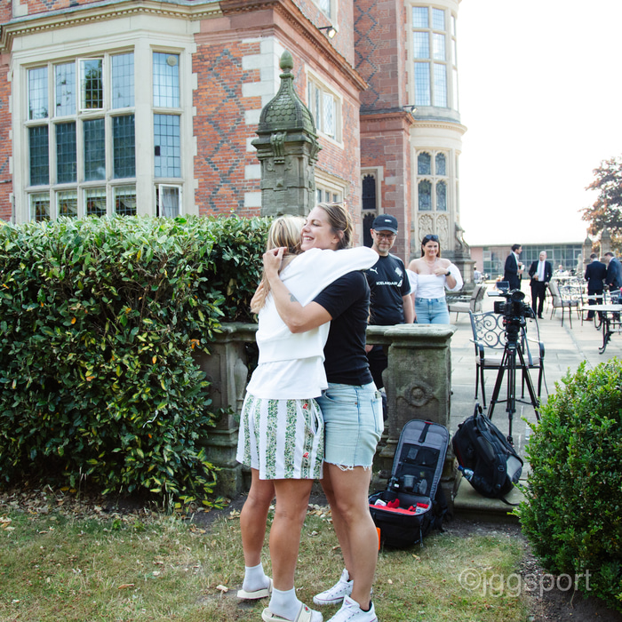 Það var mjög skemmtilegt augnablik þegar Gunnhildur Yrsa lauk einu viðtalinu og sá að Harpa, fyrrum liðsfélagi sinn í landsliðinu, var mætt á svæðið.