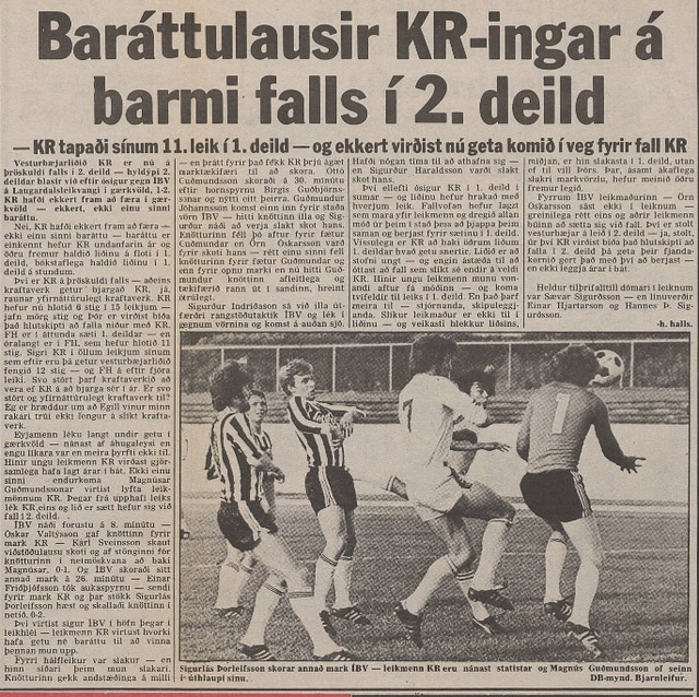 „Vesturbæjarliðið KR er nú á þröskuldi falls í 2. deild - hyldýpi 2. deildar blasir við eftir ósigur gegn ÍBV á Laugardalsleikvangi í gærkvöld, 1-2. KR hafði ekkert fram að færa - ekkert, ekki einu sinni baráttu," sagði í umfjöllun Dagblaðsins.