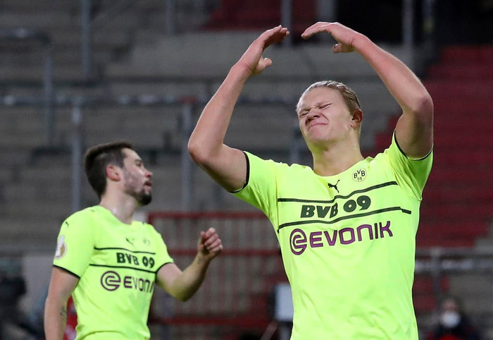 Erling Braut Haaland minnkaði muninn með marki úr vítaspyrnu en það var ekki nóg til að komast í 8-liða úrslitin. Dortmund úr leik í bikarnum þetta árið.