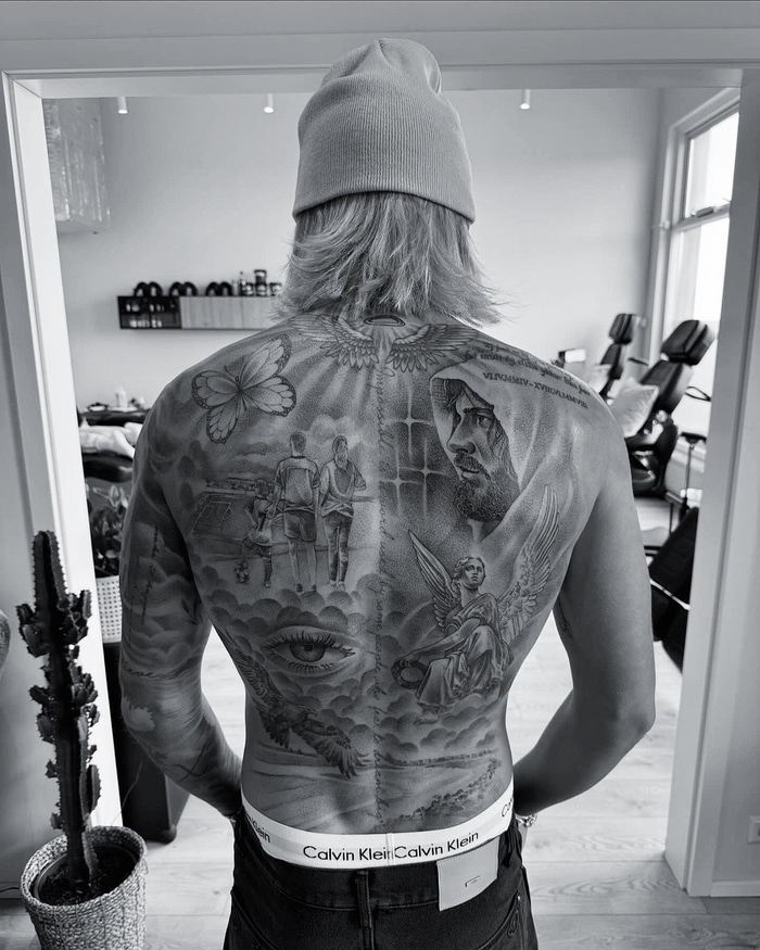 Efst hægra megin er sjálfur Jesú kristur og fyrir neðan hann er ástargyðjan Afródíta. Brynjar Björnsson flúraði listaverkið á Arnór en mynd af því má sjá hér fyrir neðan.